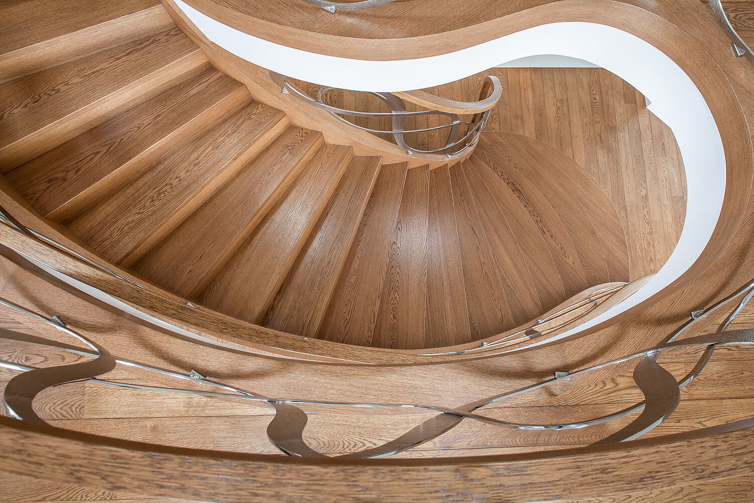 This arched staircase made of stained oak with a concrete core decorates a residence in Poznań. What is particularly eye-catching is the complex hammered look of the metal railing, which had to be elaborately worked by hand. The production of such a unique piece requires years of experience in stair construction and is evidence of perfection in design as well as traditional craftsmanship.