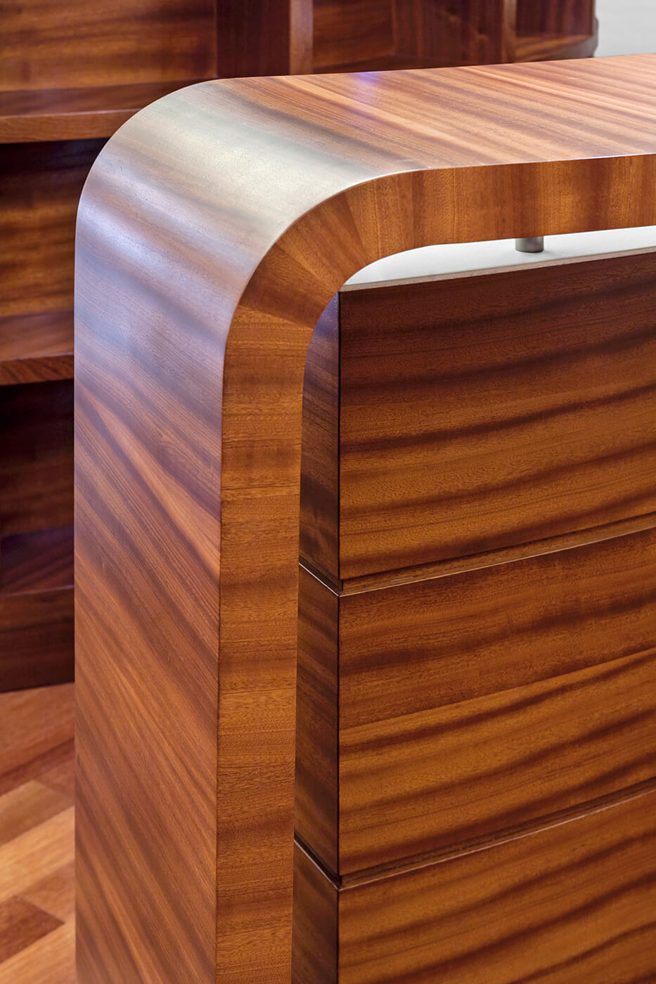 Diese gewendelte Wangentreppe im Stil des Art-Déco wurde aus Sapelli maßgefertigt und befindet sich in einer Wohnresidenz in Łódź. Die aufwendig gebogenen Treppenwangen tragen das edle Geländer aus Holzbändern. Sie zeigt, dass Art Déco nicht nur durch die Farbe Schwarz und hochglänzende Oberflächen charakterisiert wird. Es ist die Wahl und das Akzentuieren bester Materialien, die diesen Stil prägen.