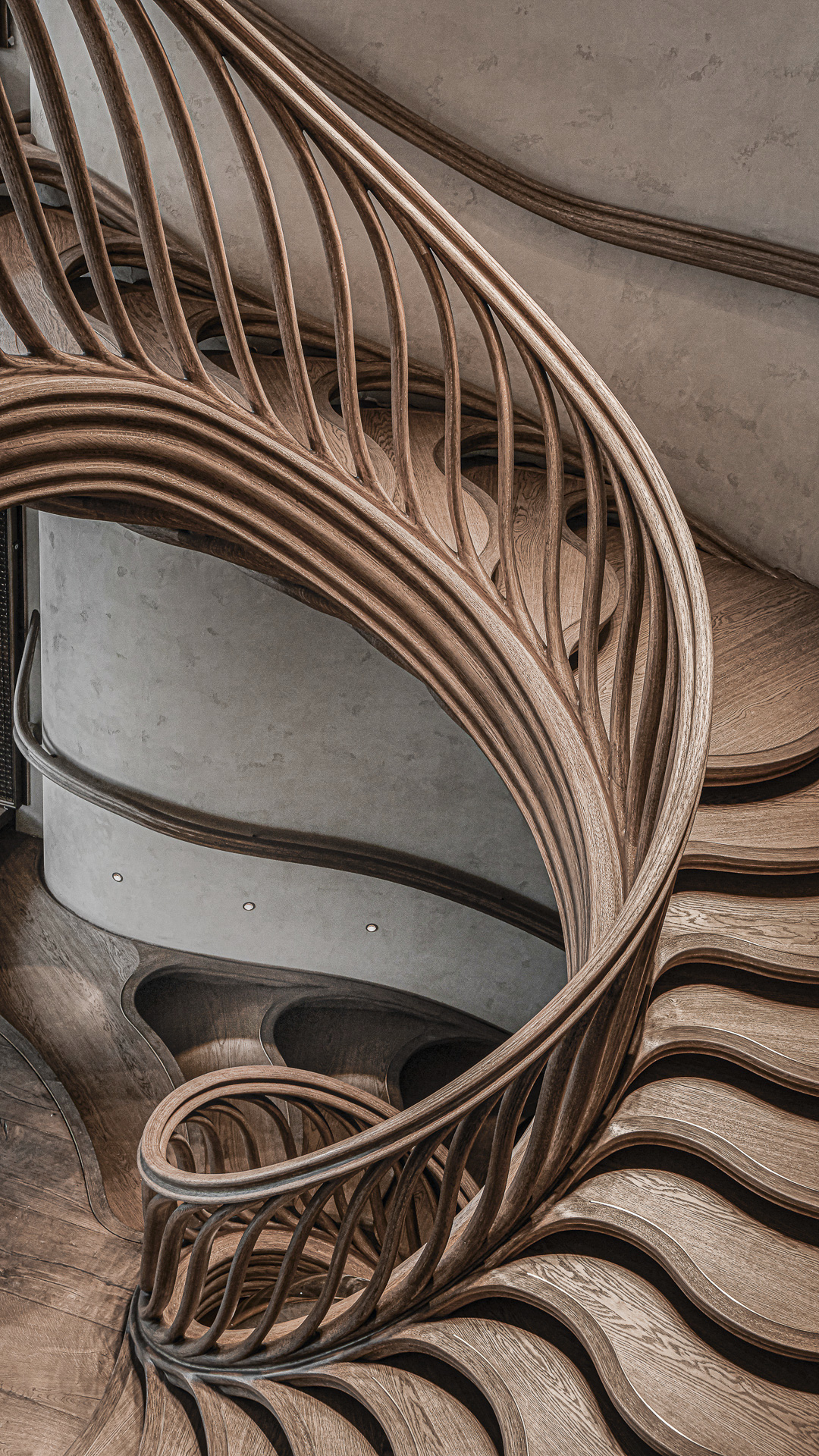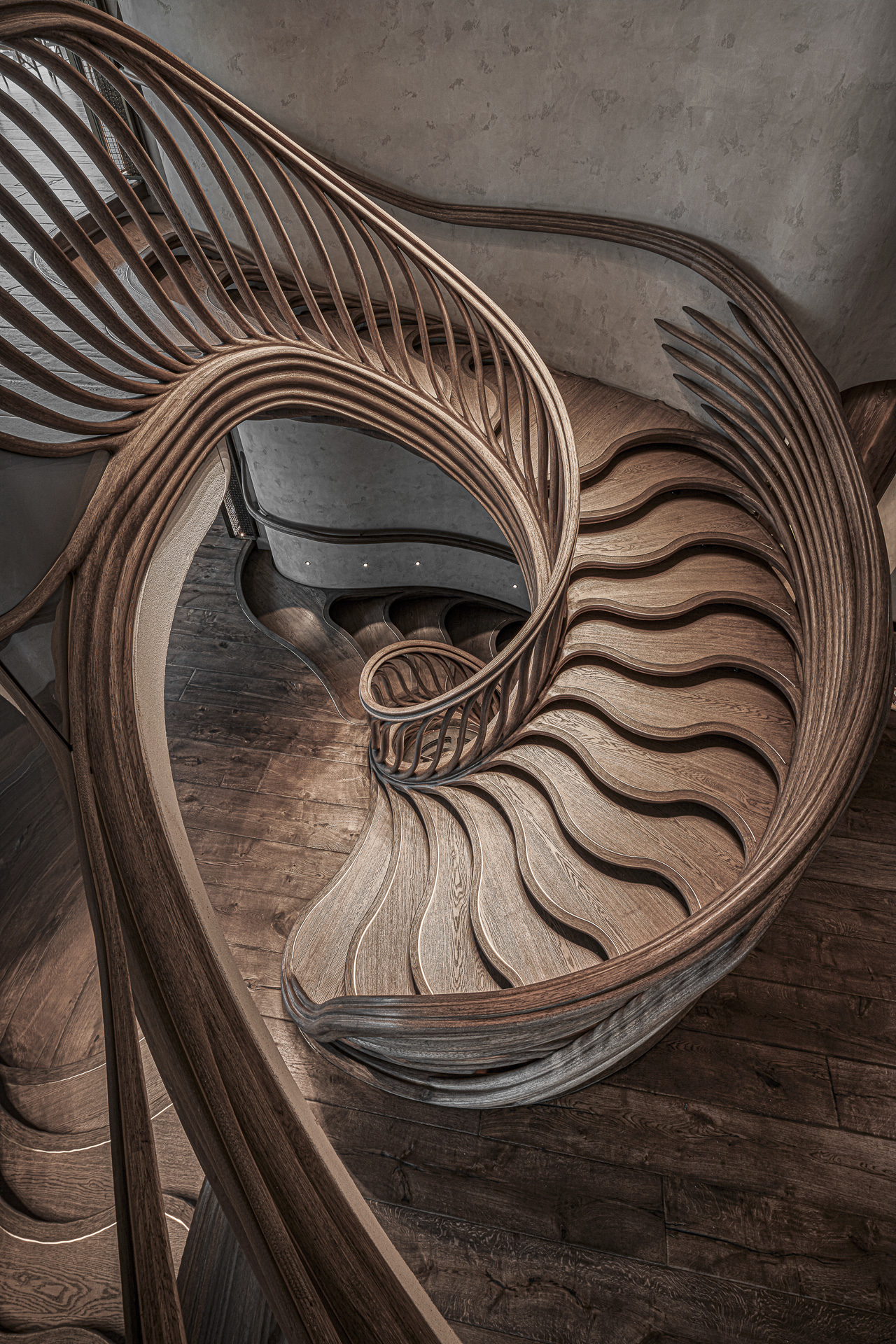 Hedonismus und guter Geschmack sind Phänomene, auf die man sowohl in der Architektur als auch in der kulinarischen Welt trifft. Im Londoner Restaurant HIDE von Tatiana Fokina und Evgeny Chichvarkin steht neben der Kulinarik diese organische Wendeltreppe aus Eichenholz im Mittelpunkt des Geschehens. Vom Londoner Designer Alex Haw von Atmos Studio entworfen, durch Heyne Tilgt Steel als Statiker geplant und von Trabczynski errichtet, fesselt diese Konstruktion die Blicke aller Gäste. Das unikale organische Design vermittelt dabei den Eindruck, dass sich die Wangentreppe aus der etwas schummerigen, verrauchten Bar zum Tageslicht hin nach oben windet und hinein in das Restaurant rankt. Jedes der einzelnen ast- bis knochenartigen Elemente des Treppengeländers besticht durch seine Individualität. Eine solche Handwerkskunst erfordert vor allem drei Aspekte: Zeit, Talent und Geduld.