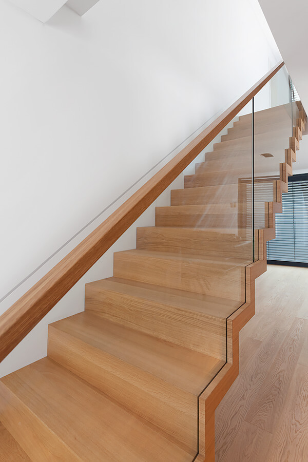 Obgleich Stahnsdorf in Brandenburg von zahlreichen Kirchen aus dem Hoch- und Spätmittelalter charakterisiert wird, fällt auch hier oft die Wahl des Treppendesigns auf den Bauhausstil. So besticht diese Faltwerktreppe aus geöltem Eichenholz durch ihre anmutende monolithische Form sowie durch die puristische Glasbalustrade. Bauhaus bedeutet Leidenschaft für den Minimalismus.