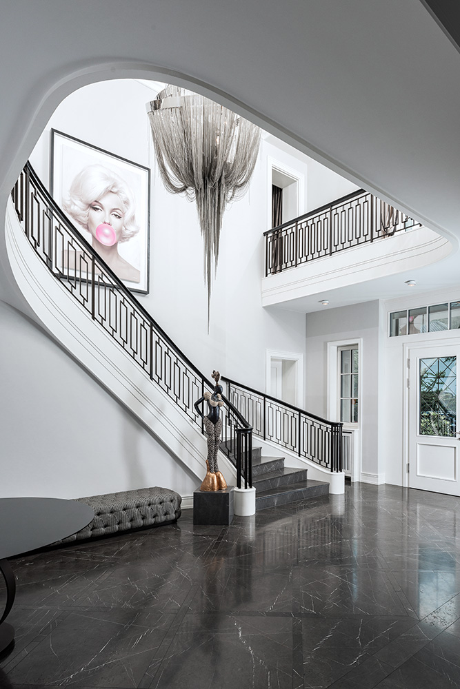 Mit dieser fantastischen Treppenanlage im „New Art Déco“ Design haben wir eine Villa in Berlin-Dahlem bereichert. Es war das erste exklusive Villenprojekt, das in einer Zusammenarbeit mit dem Stararchitekten Paul Kahlfeldt, dem Innenausstatter Pawel Ostrowski vom Einrichtungshaus Herrendorf sowie mit dem Architekturbüro Rüdiger Semang realisiert wurde. Die Betontreppe verfügt über dunkle Stufen aus Naturstein und weiße Holzwangen. Das handgefertigte Treppengeländer besteht aus punktgeschweißtem Schwarzstahl mit einem Holzhandlauf aus Räuchereiche. Entstanden sind 35 Meter pure Augenweide, die die Herzen der Bewohner und diejenigen ihrer Gäste höherschlagen lässt.