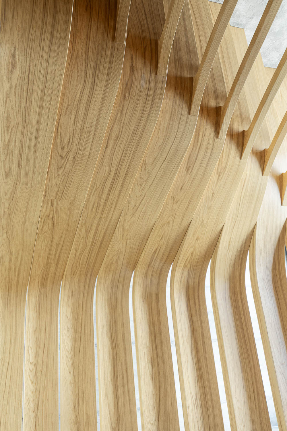 Diese Treppe ist ein architektonisches Highlight im Eingangsbereich einer modernen Villa in Warschau. Die Kragarmkonstruktion aus Eichenholz überzeugt durch fließenden Minimalismus und fügt sich harmonisch ins puristische Raumkonzept ein. Freischwebende Stufen ohne sichtbare Unterkonstruktion und die elegante Biegung zwischen den Läufen verleihen ihr skulpturale Qualität und organische Ästhetik. Das Geländer mit geschwungenen, filigranen Holzstäben erinnert an stilisierte Äste und betont die Leichtigkeit der Konstruktion. Ein gelungenes Zusammenspiel aus Design, Handwerkskunst und Raumwirkung – funktional und eindrucksvoll inszeniert.