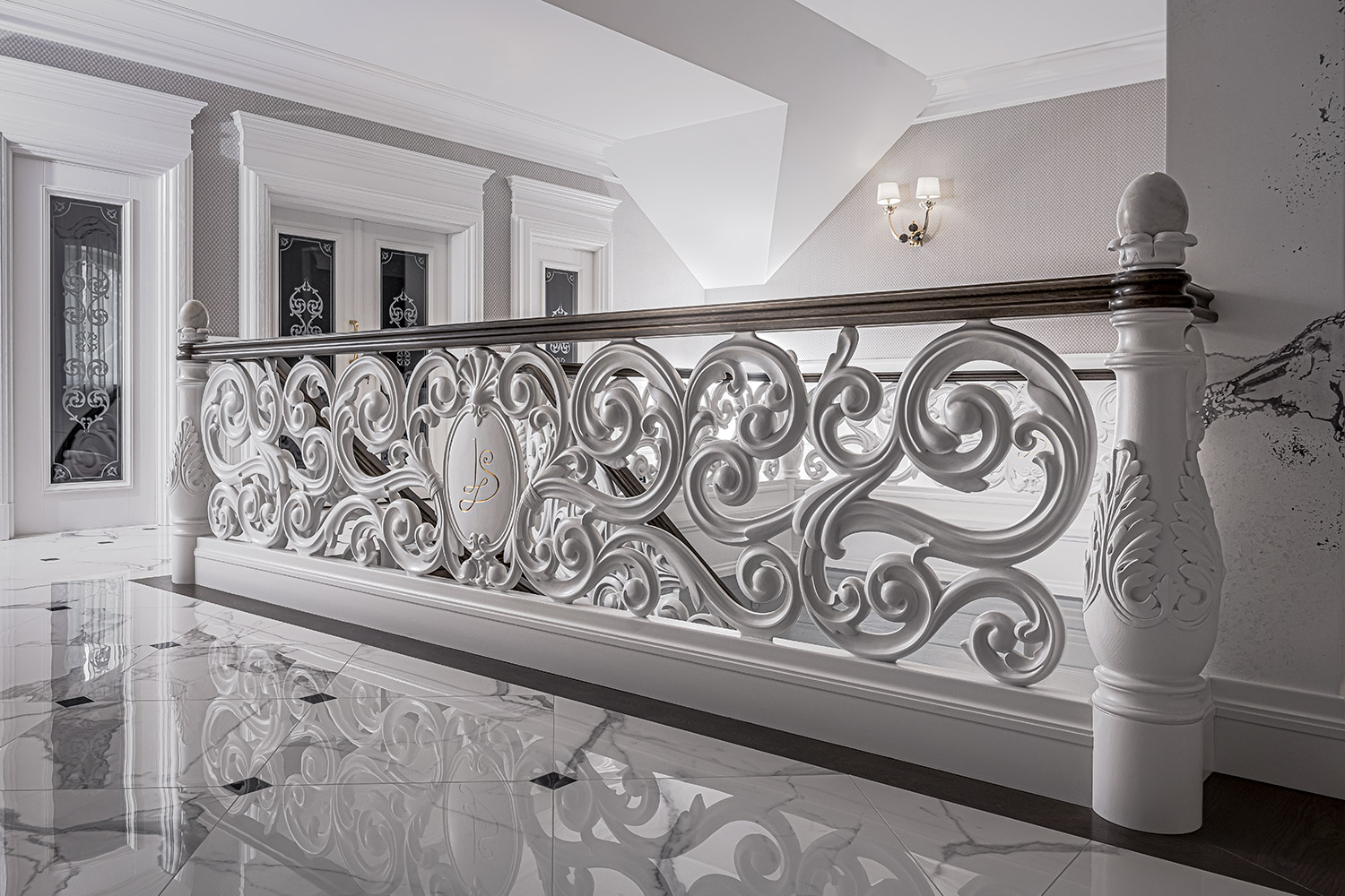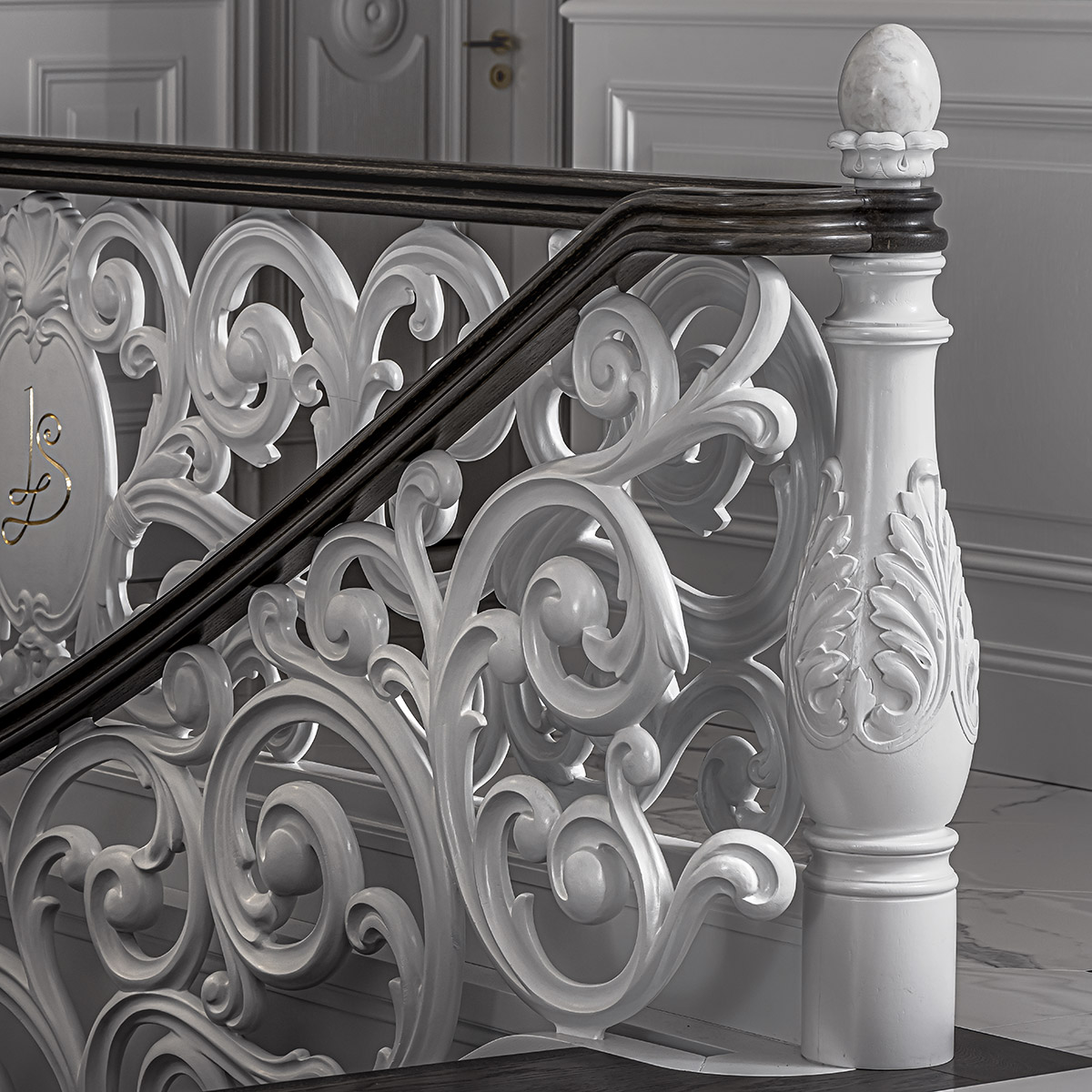 In Warschaus malerischer Peripherie realisierte markiewicz einen handwerklich äußerst herausfordernden Auftrag. Eine exklusive Wohnresidenz, die der Kreativität des Architekturbüros Tomasz Czajkowski entstammt, wurde mit einer einzigartigen, handgefertigten Treppe ausgestattet. Das Prunkstück dieser Bogentreppe ist das handgeschnitzte Holzgeländer im Stil des Barock. Es scheint, als erzählte das Geländer, dessen Fertigstellung allein über 7.000 Arbeitsstunden in Anspruch nahm, die Geschichte dieser einzigartigen Kunst- und Architekturepoche nach. Dafür stehen geschwungene Linien, reiche Verzierungen und kunstvolle Arrangements.